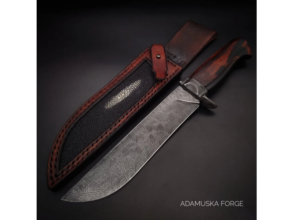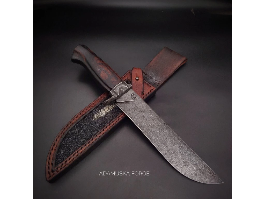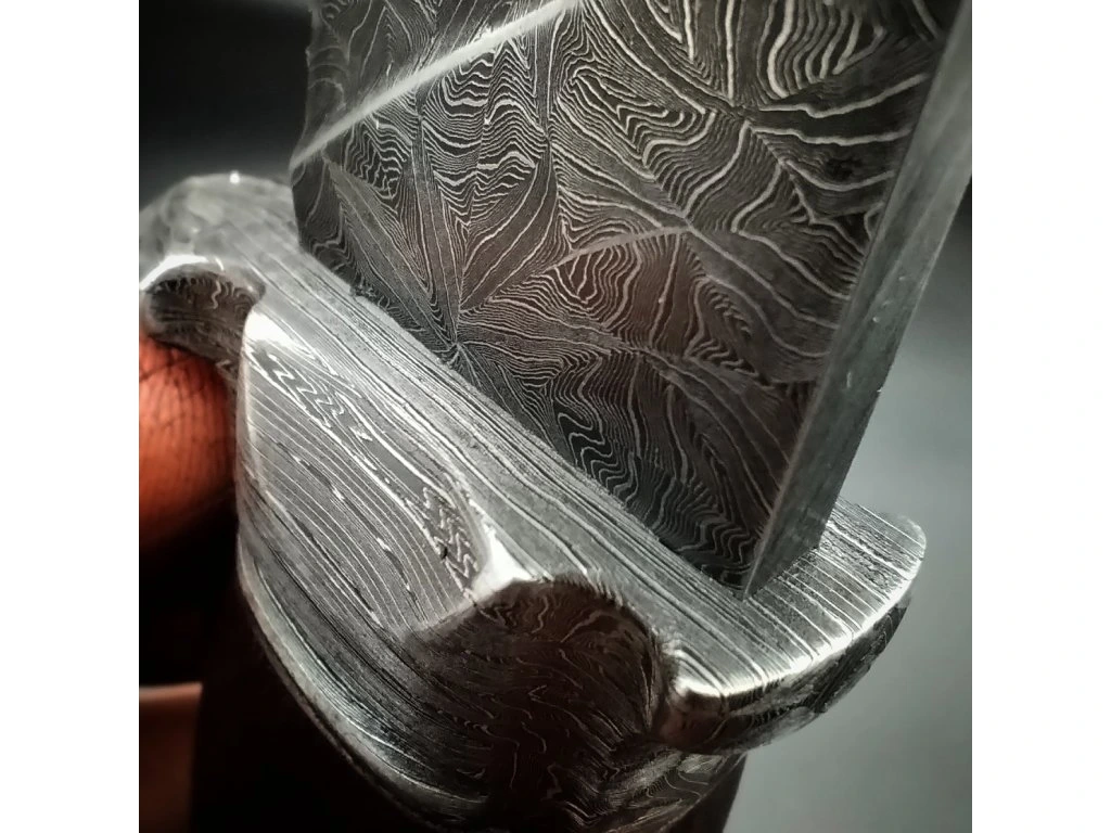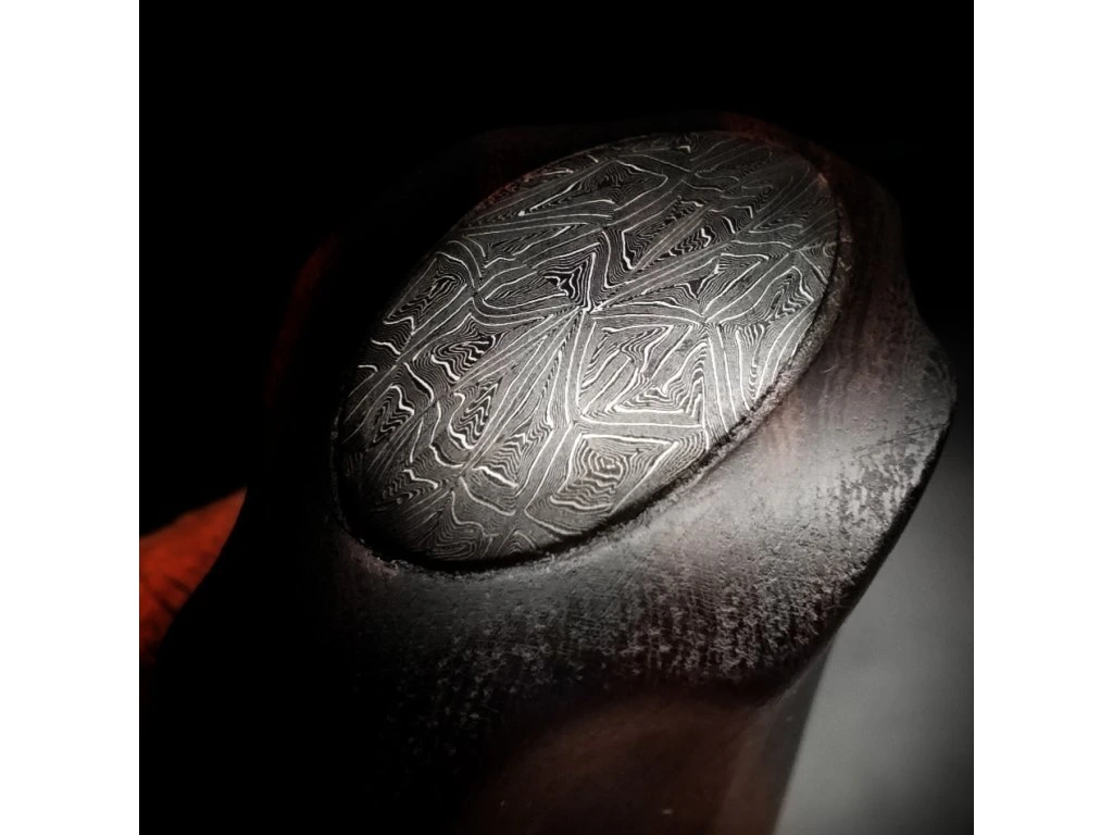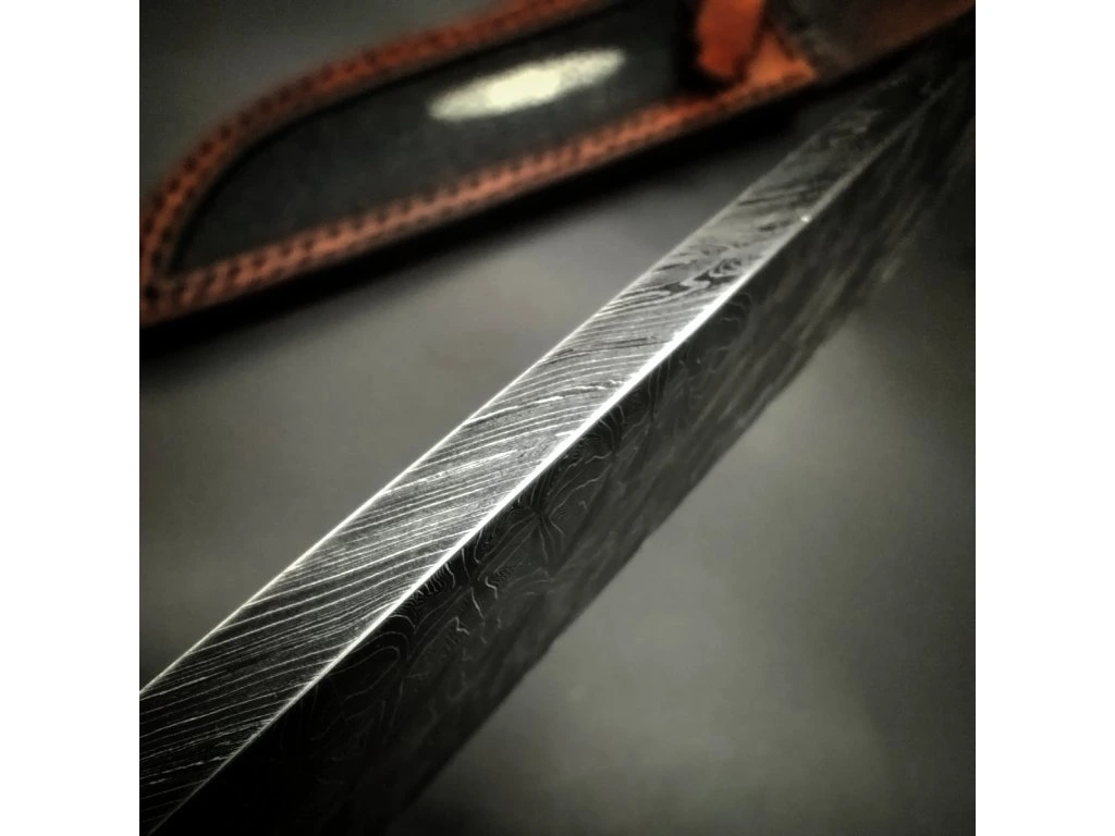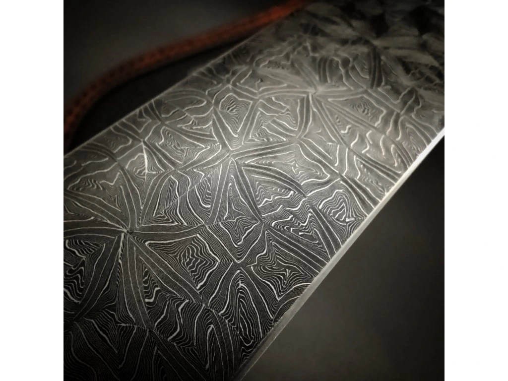 Ručně kovaný damašek se skládá z 300 vrstev ocelí 19312 a 15N20. Tato kombinace zaručuje vynikající mechanické vlastnosti: houževnatost, vysokou agresivitu řezu a díky niklu v oceli 15N20 také hluboký, kontrastní vzor. Čepel o tloušťce 3,5 mm je zakalena na 59–60 HRC, což je ideální hodnota pro dlouhou výdrž ostří při zachování dobré brousitelnosti.