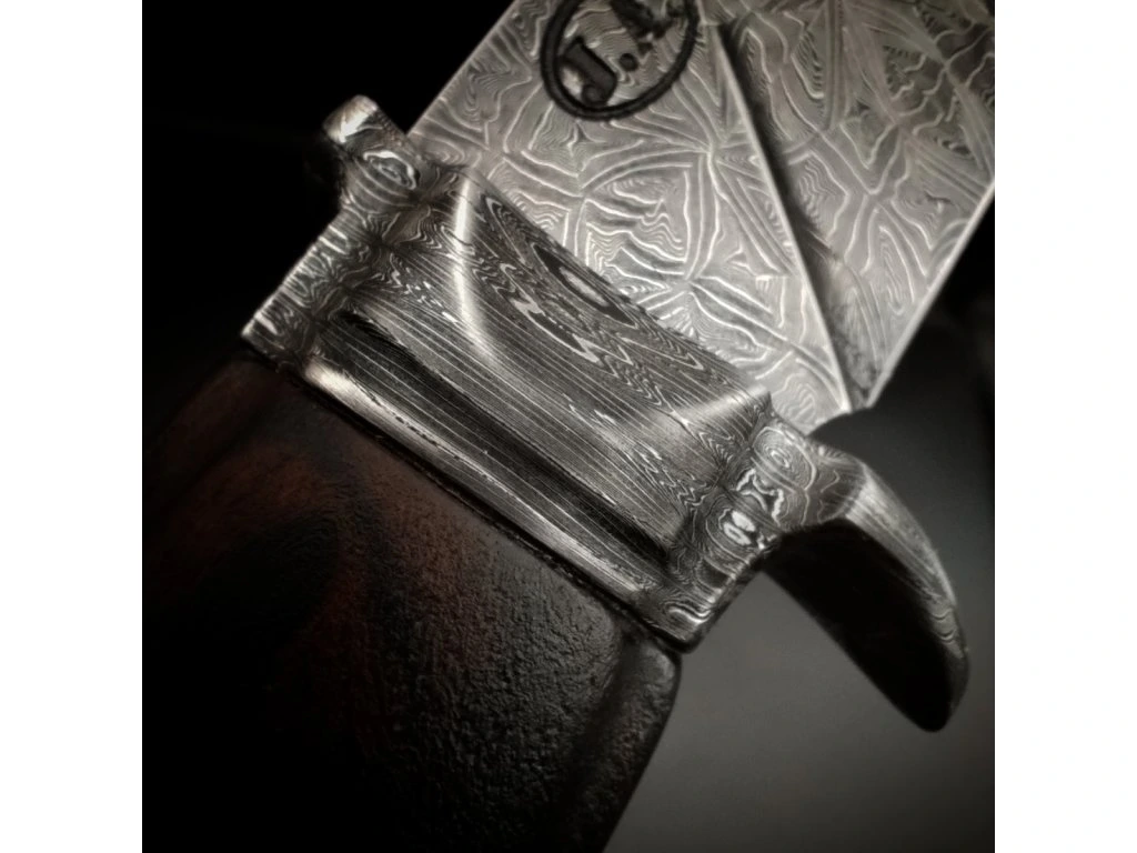 Symetrii a luxusní vzhled podtrhuje celodamašková konstrukce – záštita i patka nože jsou vykovány ze stejného mozaikového bloku, což vytváří dokonalý vizuální rámec pro rukojeť z pouštního Ironwoodu. Toto dřevo, ponechané v arizonské poušti, patří k nejtvrdším a nejkrásnějším materiálům světa a svou temnou barvou dokonale doplňuje koncept Mosaic Shadow.
