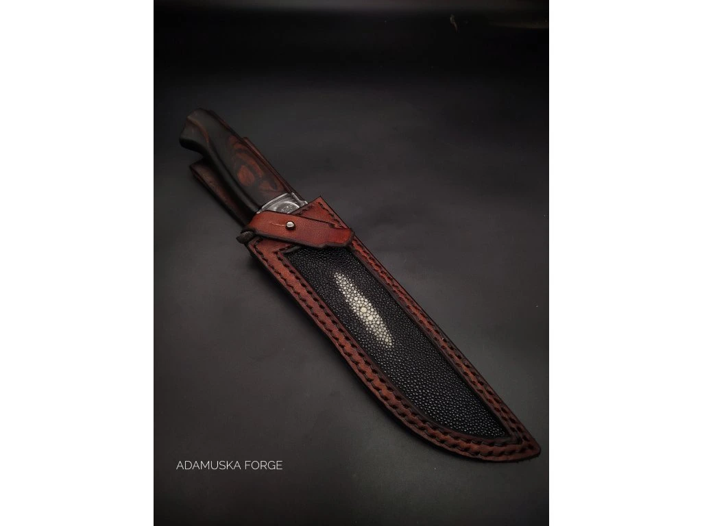 K noži náleží unikátní pouzdro z 3mm hovězí usně, doplněné o vklad z pravé rejnočí kůže. Rejnok je známý svou extrémní odolností a perleťovým leskem, který z tohoto setu dělá sběratelský unikát.